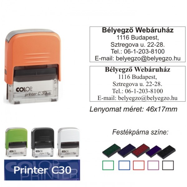 Colop Printer 30 automata önfestékező bélyegző. Maximum 5 soros bélyegzőlenyomat. Az ár az elkészített, komplett bélyegzőre vonatkozik.